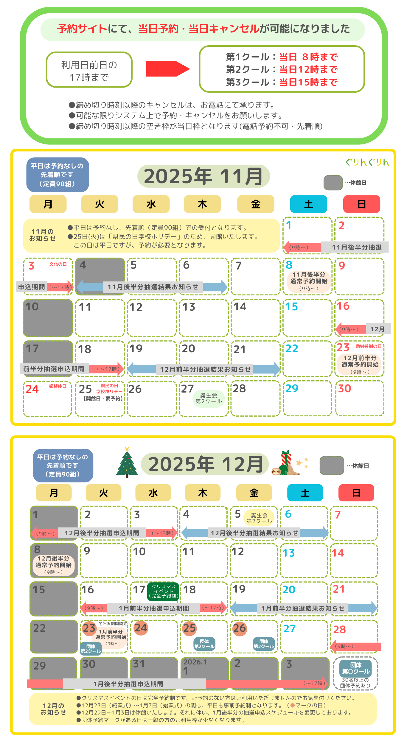 ●23日(火)~26日(金)は、冬休み期間のため平日ですが予約が必要となります。